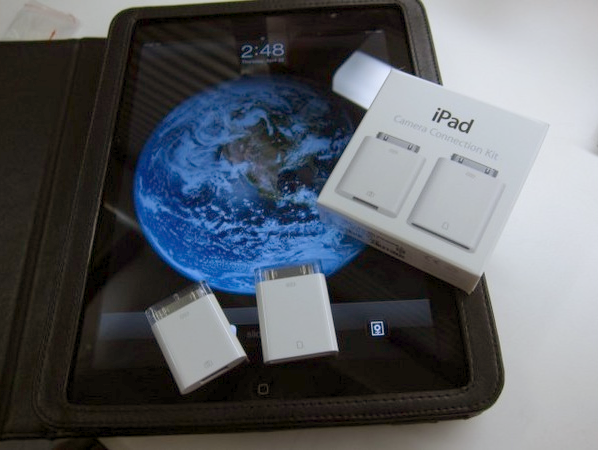 The Camera Connection Kit comes with a paor of dongles that convert the 30 pin dock connector in to a USB connection. One of the dongles is home to an SD card reader while the other is a USB adapter allowing you to connect your camera up to the iPad.
