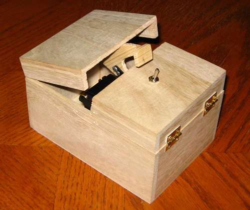 When switching the toggle switch on the lid opens and a wooden hand type device jumps out and switches the switch off. The device has no micro-controller inside and everything is analogue. Check out the video below.