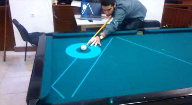 A video uploaded to YouTube shows a device called the PoolLiveAid that detects the angle of the cue and then projects lines on to the table to show where the ball will bounce to. When contact with another ball is detected it will also show where the other ball will end up going.
