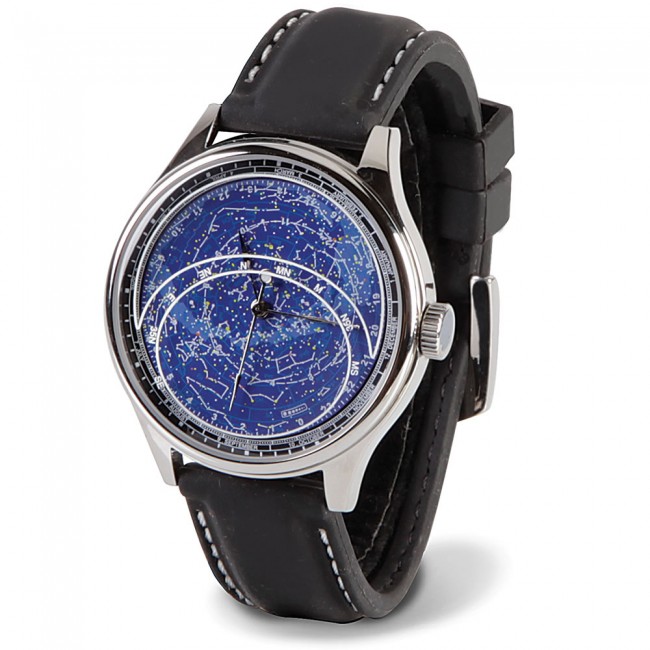 This watch contains all the major constellations that can be seen in the northern hemisphere. The watch part is quartz which allows it to keep relatively accurate time.