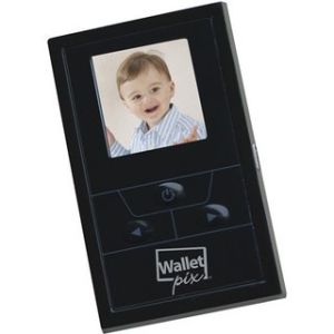 The Wallet Pix is a credit card sized photo viewer. It can store 58 wallet sized pictures in memory and has batteries included. It uses plug and play software allowing you to quickly connect it to transfer images. It can auto switch off to save batteries and it will resize images to fit the screen.
