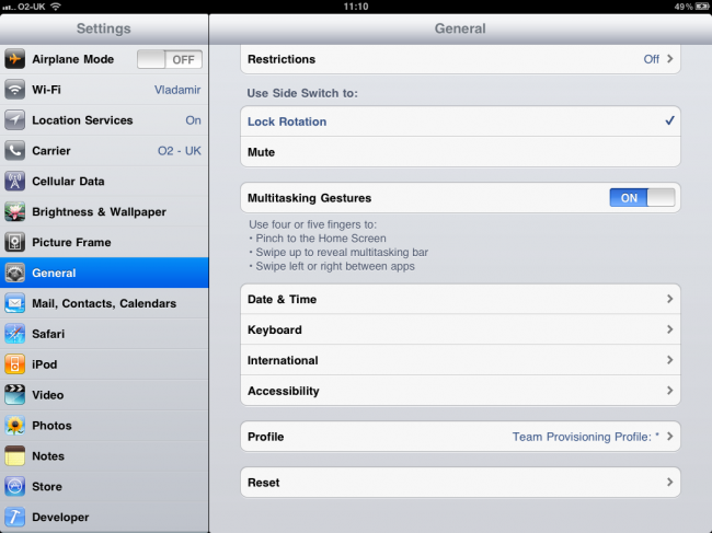 When you have updated to iOS 4.3 beta 1, you might just see the “Use Side Switch to:” additional item in the General Settings menu with the multitouch gestures options missing. If this is the case just follow the instructions below…