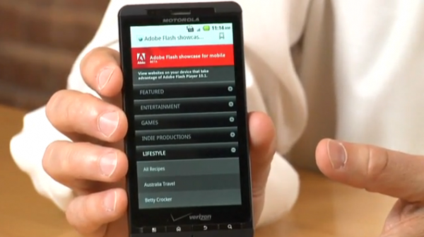 Adobe decided to tease potential DROID X owners by demonstrating how Flash 10.1 runs on the device. The company demo a few games which easily run full screen by tapping on them. The results are quite impressive and provide full screen action that Adobe said can be easily mistaken for a full fledged app running on the device.