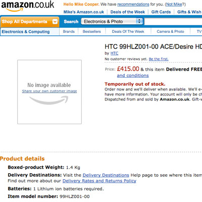 Amazon in the UK priced it at £415 which will be off contract and not subsidised. The product was listed with the following title… “HTC 99HLZ001-00 ACE/Desire HD” with the ACE part being heard of before.