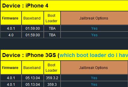 Just to show you what sort of things it points out. If you have an iPhone 3GS running iOS 4.0.1 (the latest version from Apple [AAPL]), there are two possible boot loaders installed. Both can be jailbroke, but the latter of the two boot loaders cannot yet be unlocked.