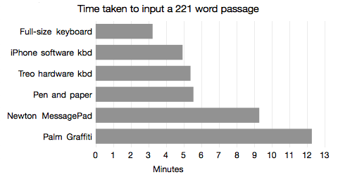 To see how long each test took, check out the graph below. For a full explanation of how text entry was like on each device check out Gyford.