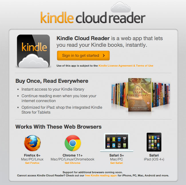 Browsers supported by Kindle Cloud Reader includes Firefox, Chrome and Safari on iOS or the desktop. Amazon has come a long way with the Kindle and expects to make books even more accessible wherever you are.