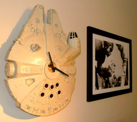 The clock here is built from an old Millennium Falcon from Star Wars and uses the centre point of the ship to embed clock work in to it’s innards.