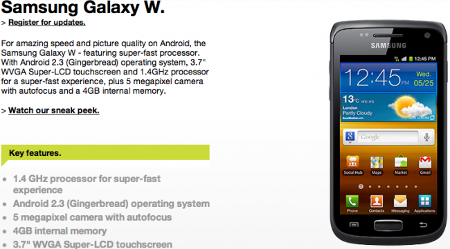 The Galaxy W is one of the first phones to use Samsungs new Galaxy naming scheme. The naming for the Galaxy range will fall under 1 of 5 letters which are: